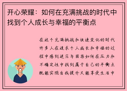 在这个充满挑战和快速变化的时代,许多人在追求个人成长和幸福的过程中感到迷茫与困惑。如何在压力和不确定性中找到属于自己的平衡点,既能实现自我提升,又能享受生活中的喜悦与满足,成为了现代人面临的重要课题。本文将从四个方面探讨“开心荣耀:如何在充满挑战的时代中找到个人成长与幸福的平衡点”,通过分析个人成长的意义、幸福的来源、应对挑战的心态以及如何在日常生活中实践这些理念,帮助我们在纷繁复杂的社会中找到内心的平静与满足。最终,文章将总结出实现平衡的关键要素,帮助每个人在这个动荡的时代中活出自己的精彩。